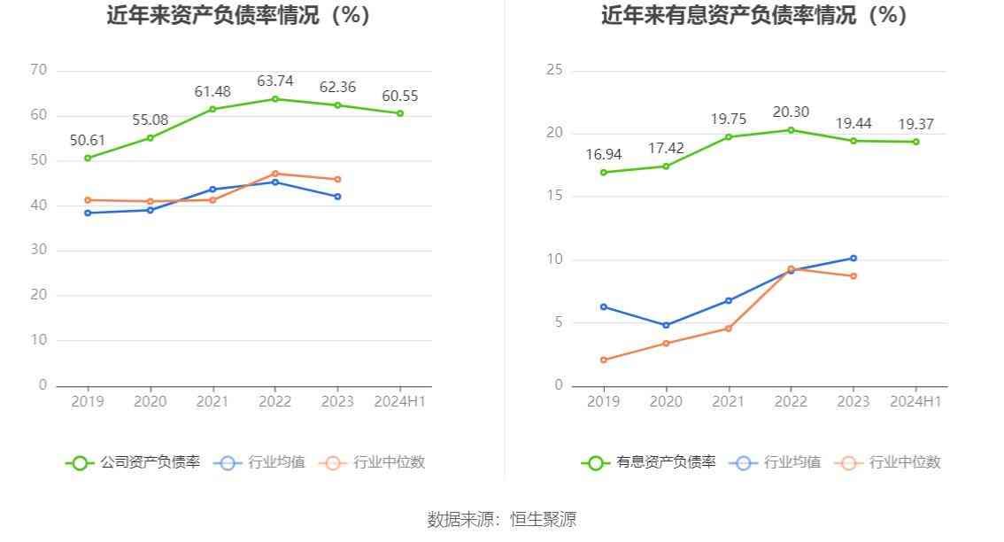 在偿债能力方面,公司2024年上半年末资产负债率为60.55%,相比上年末下降1.81个百分点;有息资产负债率为19.37%,相比上年末下降0.07个百分点。