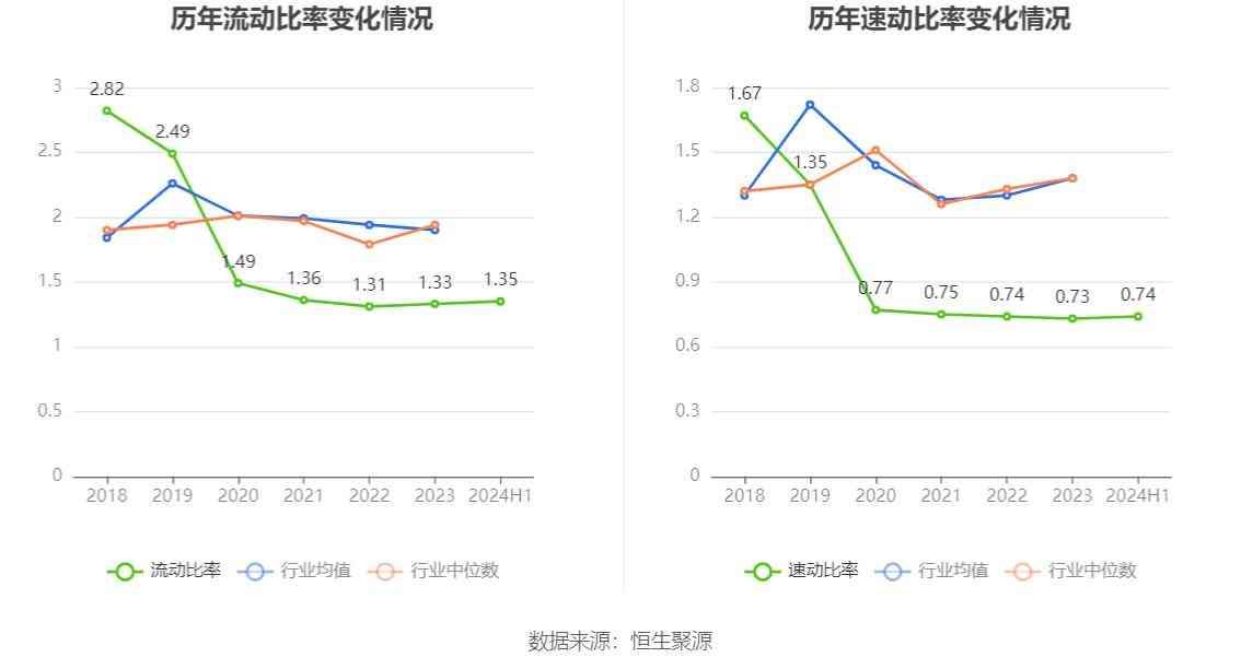2024年上半年,公司流动比率为1.35,速动比率为0.74。