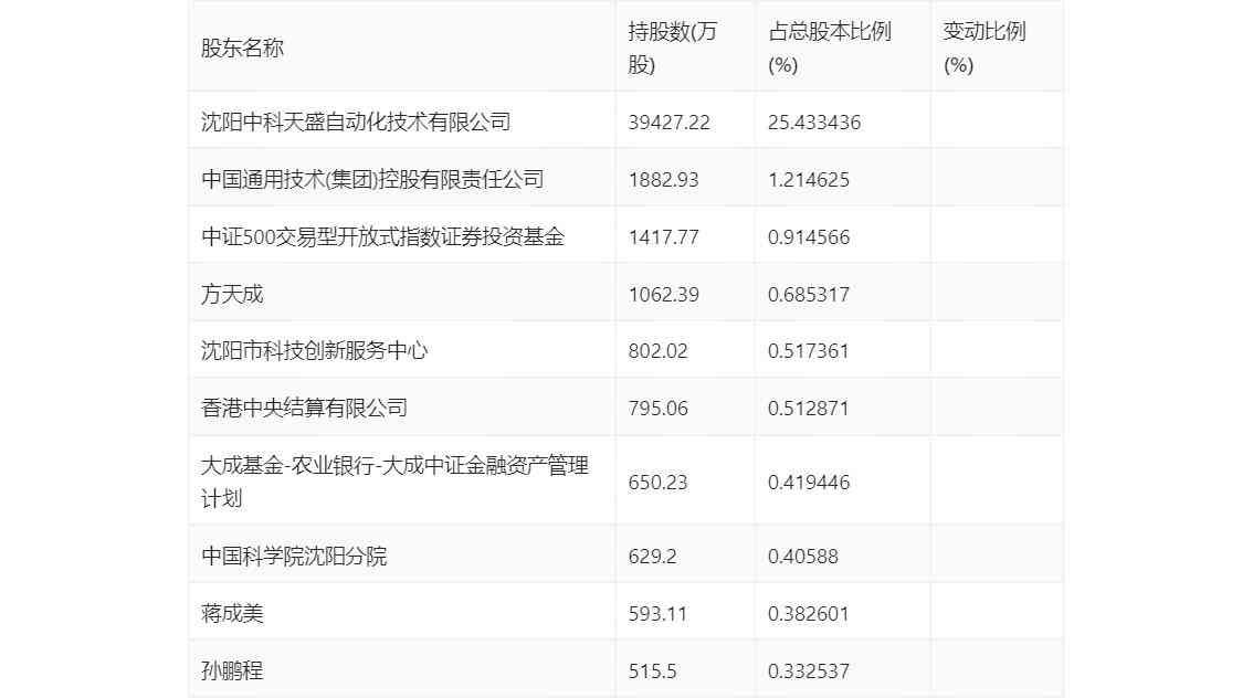 半年报显示,2024年上半年末公司十大流通股东中,持股最多的为沈阳中科天盛自动化技术有限公司,占比25.43%。十大流通股东名单相比2024年一季报维持不变。在具体持股比例上,中证5交易型开放式指数证券投资基金持股有所上升,中国通用技术(集团)控股有限责任公司、香港中央结算有限公司持股有所下降。
