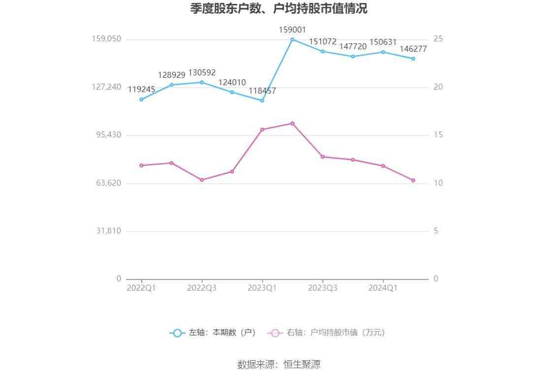 筹码集中度方面,截至2024年上半年末,公司股东总户数为14.63万户,较一季度末下降了4354户,降幅2.89%;户均持股市值由一季度末的11.82万元下降至10.32万元,降幅为12.69%。