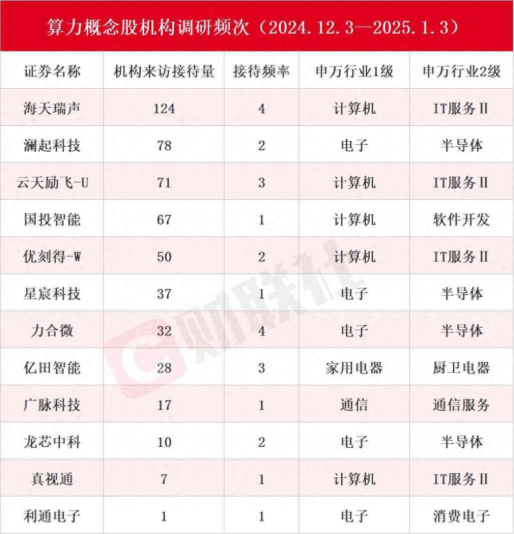 Choice数据显示,在2024年12月3日至2025年1月3日期间获机构调研的算力概念股包括海天瑞声、澜起科技、云天励飞-U、国投智能、优刻得-W、星宸科技、力合微、亿田智能、广脉科技、龙芯中科、真视通和利通电子。具体情况如下:
