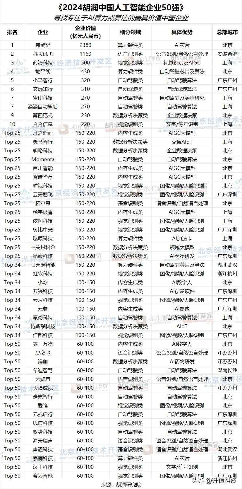 国内ai算力公司排名前十,胡润评出2024中国人工智能企业50强