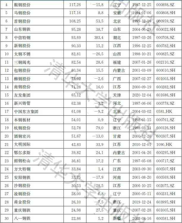 在2021中国钢铁行业上市公司品牌价值榜中,1996-2年上市的公司17家,品牌价值合计1599.68亿元,占行业榜单总计品牌价值的63.4%,排在第一位。