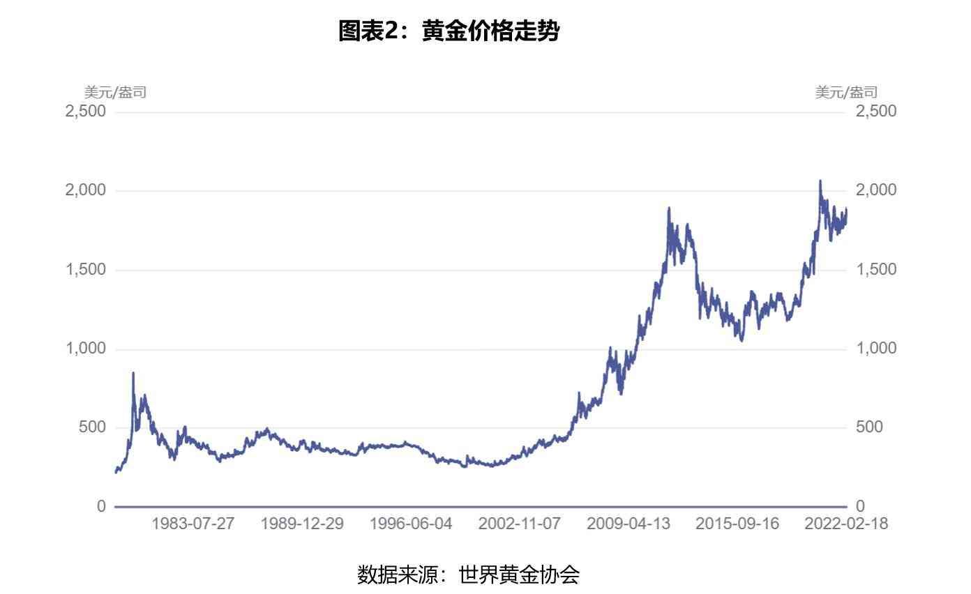 从黄金价格走势来看,21年以来,随着世界货币宽松周期到来,黄金价格快速上涨,21年初的从267美元/盎司上涨至2010年的17美元/盎司;2013年因印度及中国的珠宝需求下降且美国和欧洲的金币及金条投资大幅走低等原因,黄金价格快速下跌至2015年的11美元/盎司左右;2019年出于对全球经济的担忧,多国加大黄金储备,叠加2020年疫情下的全球货币大宽松,黄金价格持续走高,随后进入平台期,后续有望再突破新高。