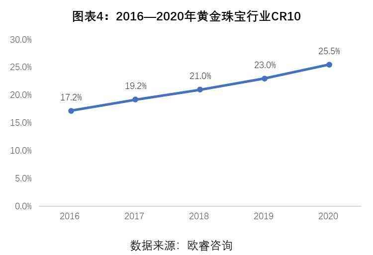 从行业格局来看,据欧睿咨询的数据显示,中国珠宝行业的CR10逐年增加,从2016年的17.2%上涨到2020年的25.5%。作为对比,中国香港、日本的珠宝行业CR10分别为56%、49%,中国珠宝行业的集中度仍有进一步提升空间。
