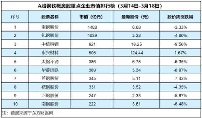 在A股市场前两个交易日呈现缩量下跌态势下,钢铁板块也被裹挟其中,本周(3月14日-18日)钢铁板块下跌4.97%。钢铁板块同大盘走势一致,在14日、15日分别下跌了3.05%、7.45%,随后的16-18日连续上涨收复失地,但仍未达到此前股价水平。
