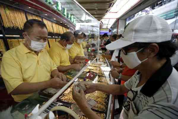 疫情期间,泰国曼谷一家金店的店员和顾客均戴着口罩交谈。(资料图片)