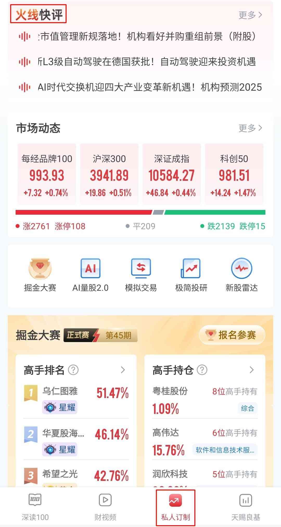第一,报名成功,就能免费查看优秀选手的持仓,在掘金大赛的主页之中上线了“高手持仓”和“掘金牛人”两个栏目,便于选手向高手学习。