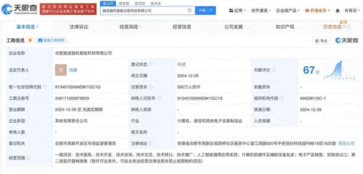 天眼查App显示,近日,合肥脑波脑机智能科技有限公司成立,法定代表人为池静,注册资本5万人民币,经营范围含人工智能通用应用系统、计算机软硬件及辅助设备批发、电子产品销售、货物进出口、第二类医疗器械销售等,由脑波(深圳)咨询合伙企业(有限合伙)、科大讯飞股东安徽言知科技有限公司、北京紫荆华融资本管理有限公司、深圳前海冰寒信息科技有限公司共同持股。
