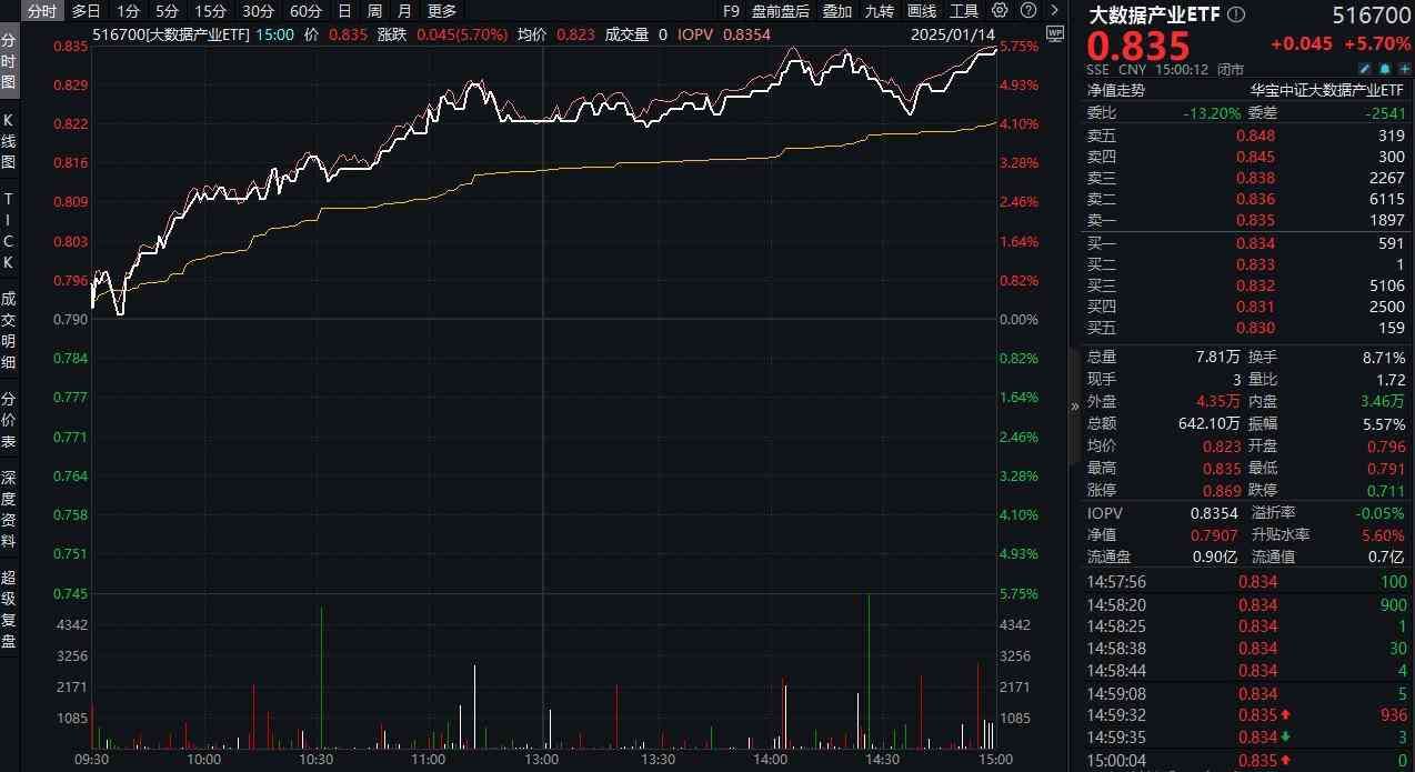 小红书走红+华为提出算点协同,大数据产业ETF(516700)飙涨5.7%,标的指数50只成份股全部涨超3%