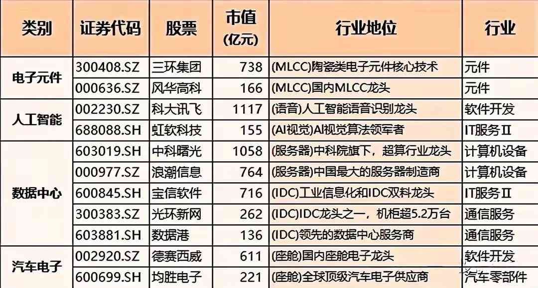 涵盖了电子元件方面,三环集团掌握陶瓷类电子元件核心技术;人工智能领域,科大讯飞为人工智能语音识别龙头,虹软科技是AI视觉算法领军者;数据中心中,中科曙光是超算行业龙头,浪潮信息是中国最大的服务器制造商;汽车电子领域,德赛西威是国内座舱电子龙头,均胜电子为全球顶级汽车电子供应商······