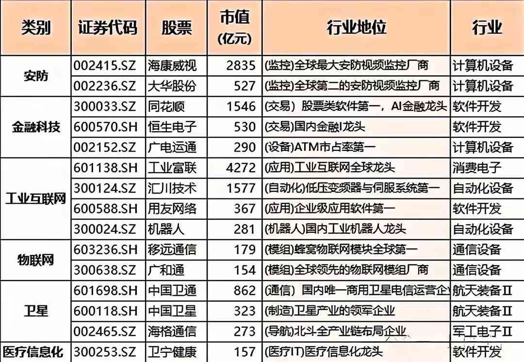 涵盖了安防领域,海康威视是全球最大安防视频监控厂商,大华股份为全球第二;工业互联网中,工业富联是工业互联网全球龙头,汇川技术在低压变频器与伺服系统居首;物联网领域,移远通信蜂窝物联网模块全球第一,广和通是全球领先的物联网模组厂商······