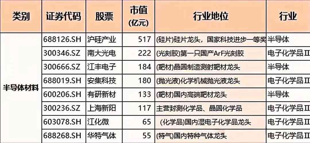 涵盖了沪硅产业是硅片龙头,曾获国家科技进步一等奖;南大光电研发出第一只国产ArF光刻胶;江丰电子为晶圆制造测射靶材龙头;安集科技是化学机械抛光液龙头;有研新材是国内高纯靶材龙头;上海新阳主营封测化学品、晶圆化学品······