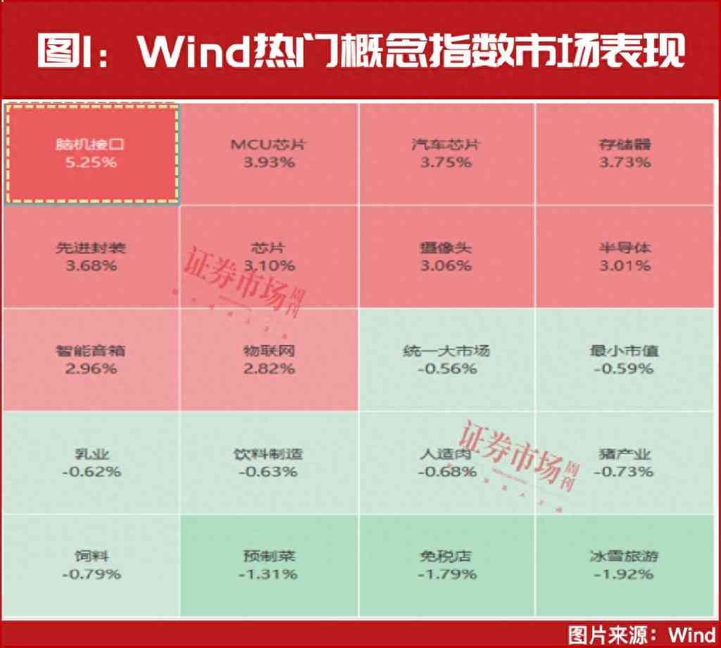12月18日,A股市场继续维持震荡走势,但局部热点依然纷呈,脑机接口概念就成了市场“最靓的仔”。截至午间收盘,Wind脑机接口指数大涨5.25%,遥遥领先(见图1)。其中,复旦复华、创新医疗、南京熊猫等多只个股触及涨停,冠昊生物、汉威科技、北大医药等纷纷跟涨。