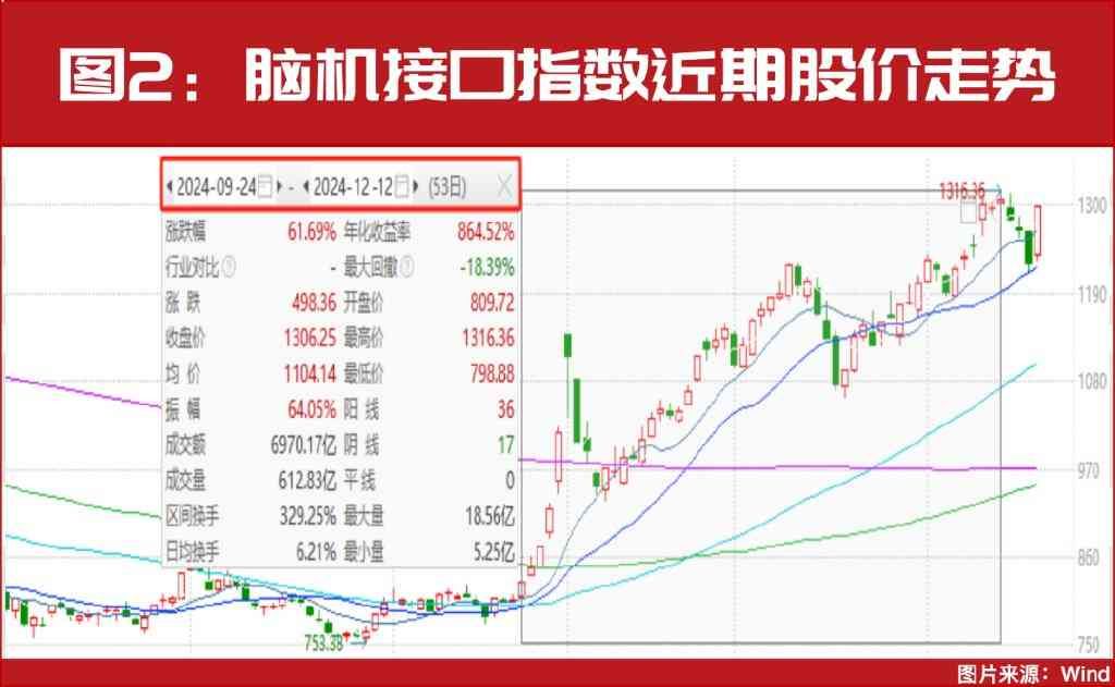 其实,拉长统计周期来看,脑机接口依然是市场最靓的仔之一。如自“9.24”行情以来,脑机接口指数持续上涨,最高涨幅超过60%(见图2)。 个股方面,截至12月17日收盘,15只脑机接口成份股全部收涨,涨幅最高的复旦复华已然股价翻倍 。