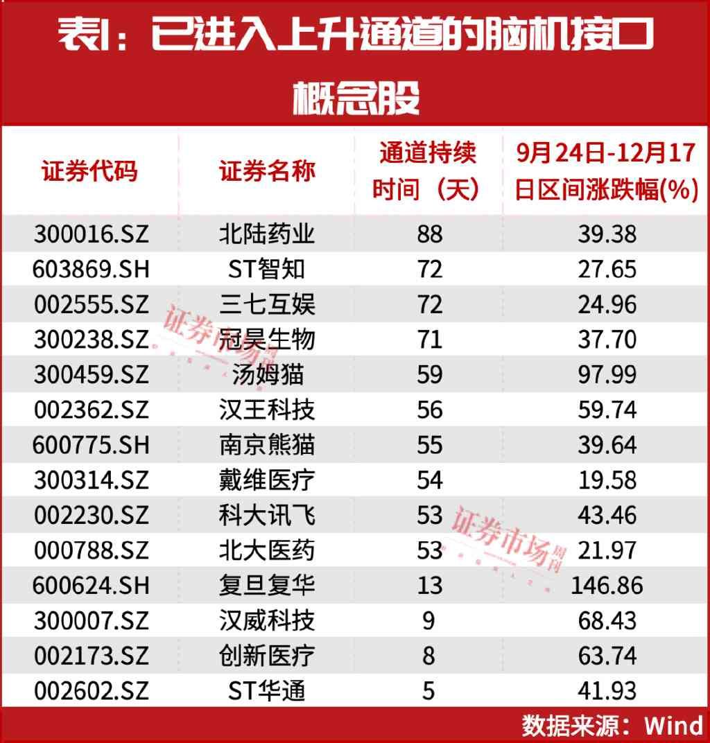 在此背景下, 15只脑机接口成份股已有14只进入了上升通道,即股价在长期内呈现持续上涨的趋势 。其中,北陆药业在上升通道的持续时间(上升通道持续时间是指当日MACD指标DIF和DEA均为正或5日均值>10日均值>20日均值,则累加计入通道持续时间)最长,达88天。ST智知、三七互娱和冠昊生物等直追其后(见表1)。