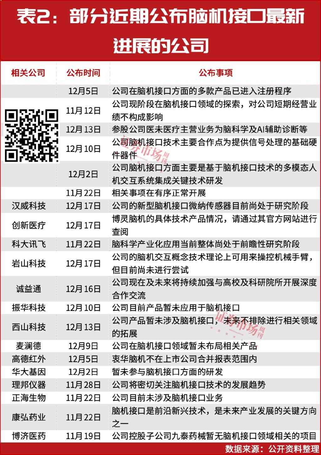 此外,汉威科技、创新医疗和岩山科技等多家上市公司也收到了投资者与脑机接口相关的提问。其中,多家公司都表示,脑机接口技术正处于研究阶段或暂未开始进行研发,仅有少数几家公司公布了在脑机接口领域的最新进展情况, 相关公司可识别表2中的二维码免费领取 。