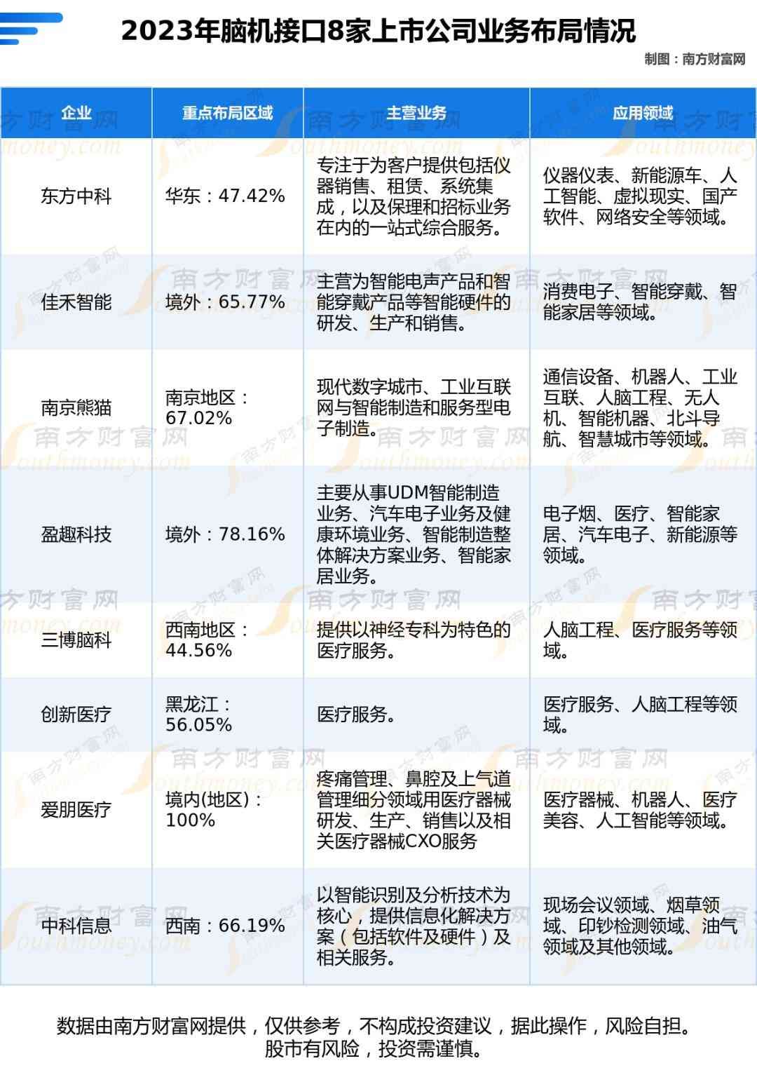 根据南方财富网产业链数据统计,业务布局上,2023年东方中科重点布局区域在华东,业务占比47.42%;佳禾智能重点布局区域在境外,业务占比65.77%;南京熊猫、盈趣科技、三博脑科、创新医疗、爱朋医疗、中科信息重点布局区域分别在南京地区、境外、西南地区、黑龙江、境内(地区)、西南,业务占比分别为67.02%、78.16%、44.56%、56.05%、1%、66.19%。