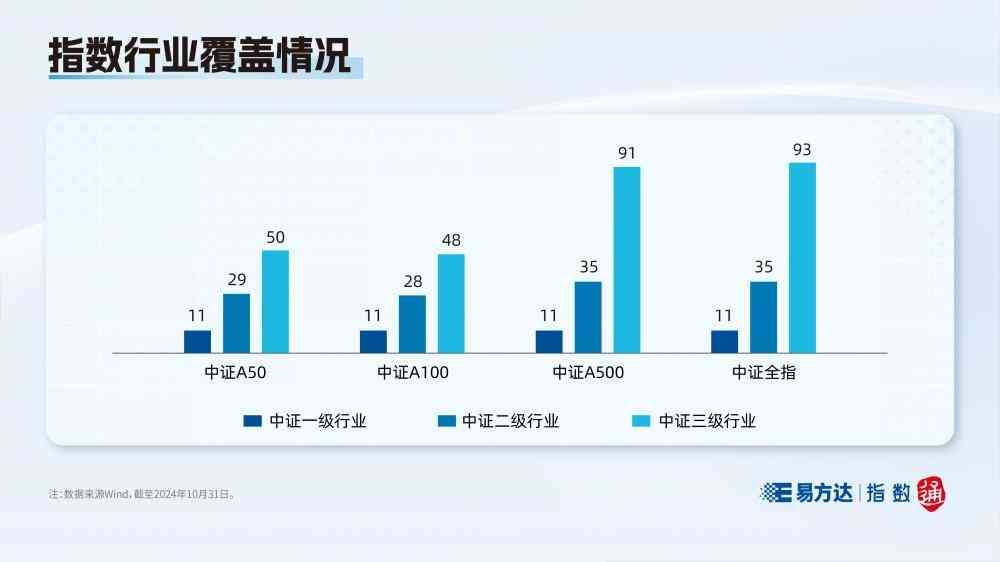 例如,中证A50指数会选取中证三级行业龙头,要求成份股为所属中证三级行业中近一年日均自由流通市值最大的,因此指数覆盖了50个不同的中证三级行业。而中证A1和中证A5指数在分别优选中证二级行业龙头和中证三级行业龙头的同时,还会尽可能使样本一级行业自由流通市值分布与中证全指一致。