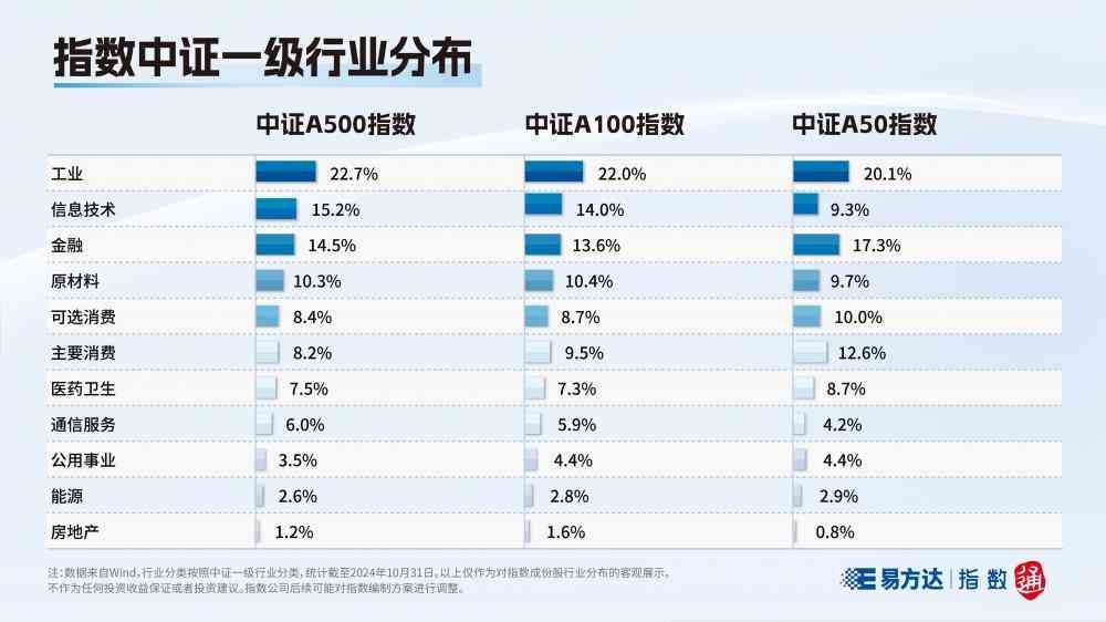 中证A1和中证A5指数的第二、第三大成份行业均为信息技术和金融,权重都在15%左右;而中证A50指数的金融与主要消费行业占比更高。