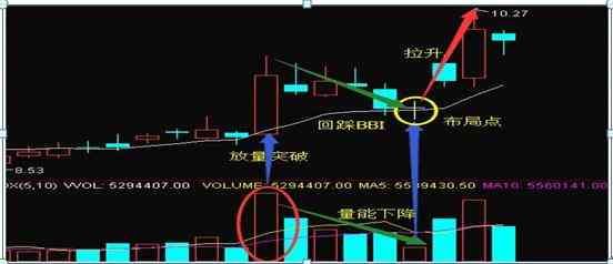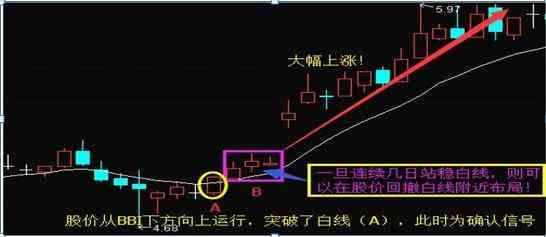 如果股价从BBI指标下方向上运动,并且穿破了BBI指标线的话,如上图A处所示,此时就是股价启动的确认信号,这时我们先观察一下,如果连续几日股价站稳BBI指标上,则尽可能在股价回撤到白线附近的时候择机下手!