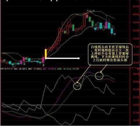 但当白线拐头向下第一次死叉绿线后,有时强势股还会有第二次上冲过程,但白线PDI不会有效上穿紫绿两线,下方的黄线同时会向上云行,此时将会形成头部。