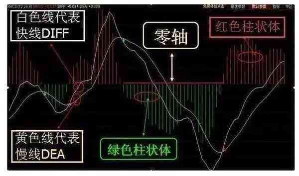 MACD是由三条线和红绿色柱体构成,黑色线是DIF线,称之为快线;紫色线是DEA线,称为慢线。中间的一条直线是零轴,红色和绿色的柱体是能量柱。