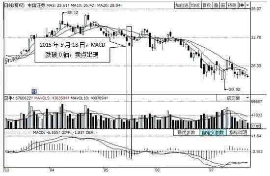 如图所示,2015年5月上旬,中信证券的股价进入高位后开始震荡盘整。2015年5月18日,随着中信证券股价的一波调整,MACD指标的快线和慢线先后跌破0轴,这说明股价马上将启动一波下跌走势,尽管此时,股价并未启动快速下跌,投资者也应卖出手中股票。此后,该股又在高位震荡盘整了几日后,开始了一波快速杀跌之路。