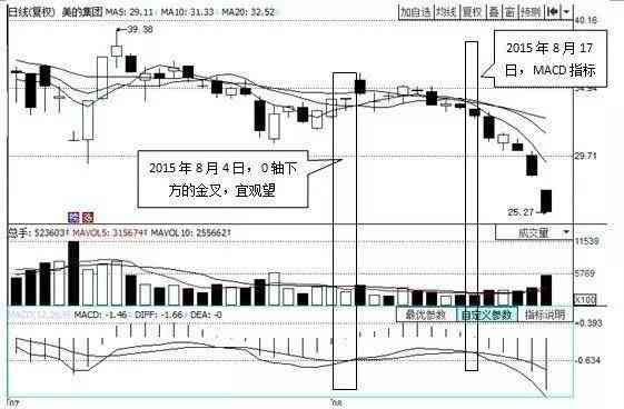 如图所示,2015年8月25日,处于震荡整理的美的集团放量收出一根T形线。同时,DIFF线向下跌破DEA线,在0轴下方形成金叉,看到此情形,投资者不宜介入。2015年8月17日, MACD的两条指标线在0轴下方形成死叉,说明股价会出现下跌走势投资者宜迅速出清手中的股票。