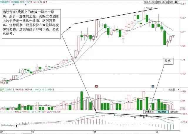 如图所示,中化国际的股价持续上升,而MACD指标走出一波比一波低的走势时,意味着顶背离出现,预示着股价可能在不久出现转头下行,可在死叉时卖出。