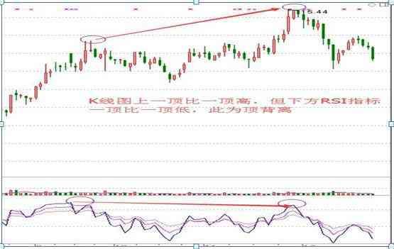 股价在一个上升趋势当中,先创出一个新高点,这时RSI指标也相应在高位创出一个新高点,之后股价出现一定幅度回落,RSI也随着股价的回落走势出现调整。但是如果之后股价再度出现冲高,并且超越前期高点时,而RSI虽然随股价继续上扬,但是并没有超过前期高点,这就是顶背离。(简单的说,就是K线图上,第二个顶比第一个顶高,但在RSI指标上,第二个顶却比第一个顶低,即为顶背离……顶背离现象一般是股价在高位即将反转的信号,表明股价短期内即将下跌,是卖出信号。如下图: