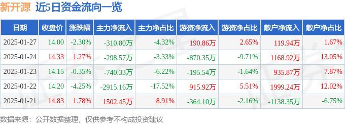 股票行情快报:新开源(300109)1月27日主力资金净卖出310.80万元
