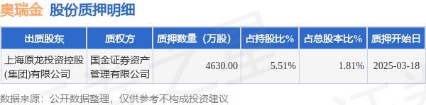 奥瑞金(002701)股东上海原龙投资控股(集团)有限公司质押4630万股,占总股本1.81%
