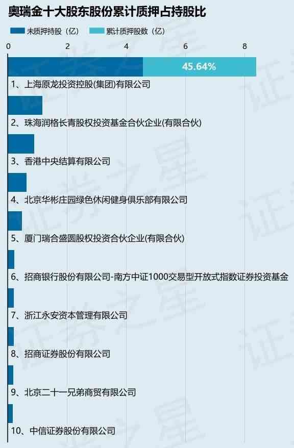 截止本公告日,股东上海原龙投资控股(集团)有限公司已累计质押股份3.84亿股,占其持股总数的45.64%。本次质押后奥瑞金十大股东的累计质押股份占持股比例(占持股比例的计算以公司最新一期财务报表公布的十大股东的持股总数为基准)见下图: