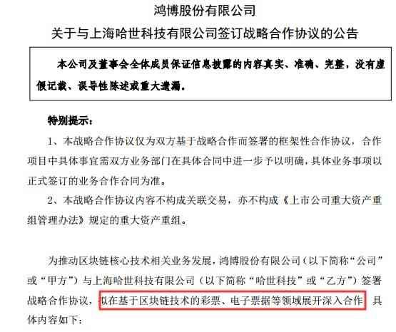 2019年11月20日,鸿博股份披露公告称,鸿博股份与上海哈世科技有限公司(以下简称“哈世科技”)签订战略合作协议,拟在基于区块链技术的彩票、电子票据等领域开展合作。
