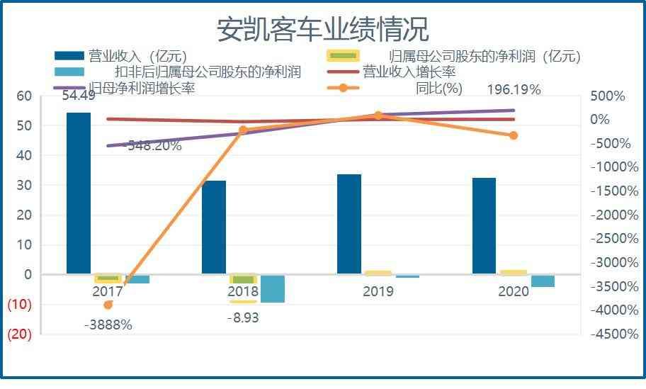 截至2020年报,安凯客车扣非净利润已连续5年亏损,其中,2017年在总营收创新高的同时,扣非净利润大幅下降。根据安凯客车年报披露,2017年营业总收入创历史最高,为54.49亿元,而归母净利润亏损2.3亿元,同比下降548.2%。