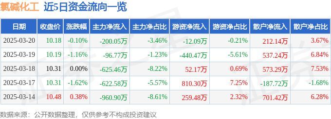 股票行情快报:氯碱化工(600618)3月20日主力资金净卖出200.05万元