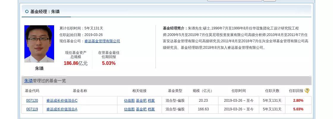 简历显示,朱璘先生:硕士,1996年7月至1999年8月任华谊集团化工设计研究院工程师;2009年5月至2010年7月任莫尼塔投资发展有限公司高级分析师;2010年8月至2011年7月任富安达基金管理有限公司高级研究员;2011年8月至2018年7月任兴业全球基金管理有限公司高级研究员、基金经理助理;2018年8月加入睿远基金管理有限公司。