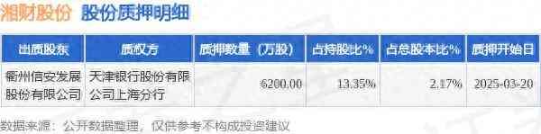 湘财股份(600095)股东衢州信安发展股份有限公司质押6200万股,占总股本2.17%