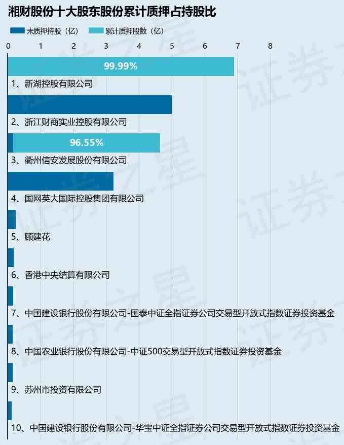 截止本公告日,股东新湖控股有限公司已累计质押股份6.9亿股,占其持股总数的99.99%,股东衢州信安发展股份有限公司已累计质押股份4.48亿股,占其持股总数的96.55%。本次质押后湘财股份十大股东的累计质押股份占持股比例(占持股比例的计算以公司最新一期财务报表公布的十大股东的持股总数为基准)见下图: