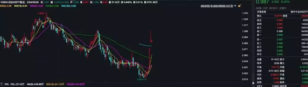 相关ETF方面,A50ETF基金(159592)截至发稿跌0.20%,成交额超3700万元,溢折率0.07%,早盘频现溢价交易。Wind数据显示,截至9月25日,该ETF近一周涨超7%。