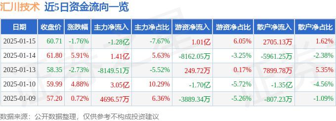 1月15日的资金流向数据方面,主力资金净流出1.28亿元,占总成交额7.67%,游资资金净流入1.01亿元,占总成交额6.05%,散户资金净流入2705.13万元,占总成交额1.62%。