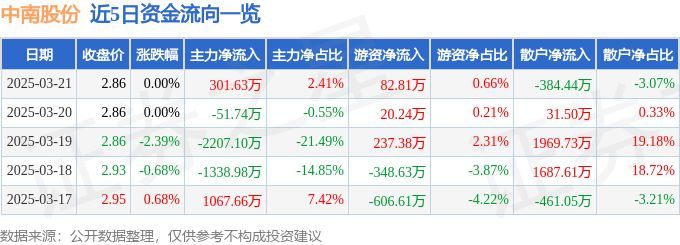 股票行情快报:中南股份(000717)3月21日主力资金净买入301.63万元