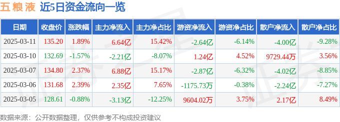 证券之星消息,截至2025年3月11日收盘,五 粮 液(000858)报收于135.2元,上涨1.89%,换手率0.83%,成交量32.1万手,成交额43.04亿元。