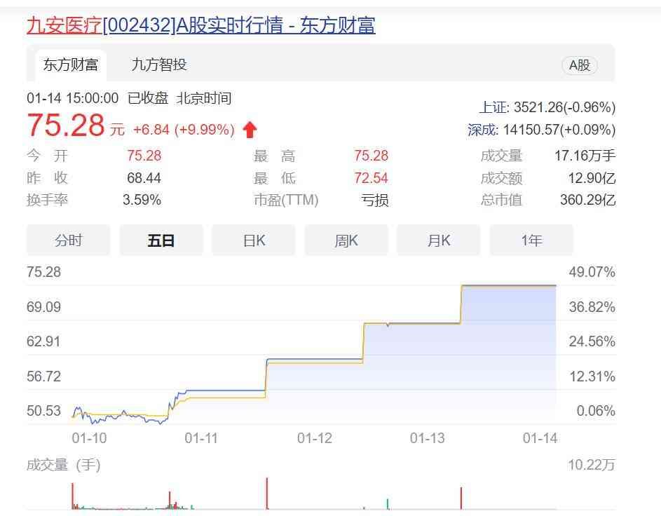 这一消息随后发酵,使得九安医疗从2021年11月15日到11月25日连续收获9个涨停板,此后继续“引爆”市场,股价从2021年11月15日开盘的6.9元/股拉升至2022年1月14日75.28元/股,涨幅近10倍。