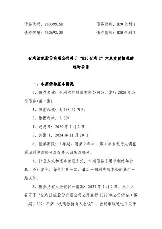亿利洁能股份有限公司(以下简称“亿利洁能”)近日发布关于“H20 亿利 2”本息支付情况的临时公告。