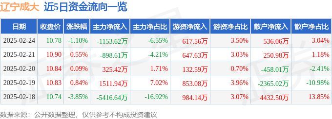 股票行情快报:辽宁成大(600739)2月24日主力资金净卖出1153.62万元