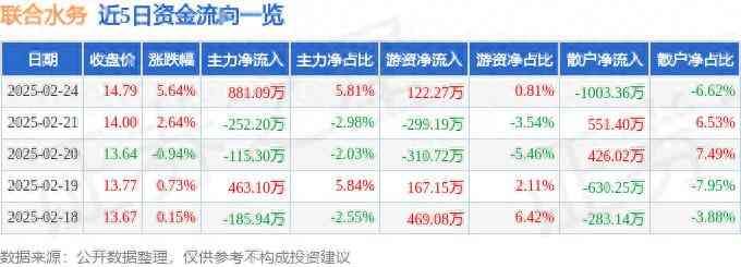 证券之星消息,截至2025年2月24日收盘,联合水务(603291)报收于14.79元,上涨5.64%,换手率7.96%,成交量10.35万手,成交额1.52亿元。