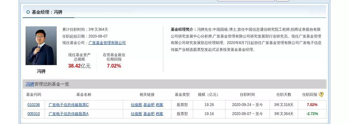 简历显示,冯骋先生:中国国籍,博士,曾任中国信息通信研究院工程师,招商证券股份有限公司研究发展中心分析师,广发基金管理有限公司研究发展部行业研究员。现任广发基金管理有限公司研究发展部总经理助理。2020年8月7日起担任广发基金管理有限公司广发电子信息传媒产业精选股票型发起式证券投资基金基金经理。