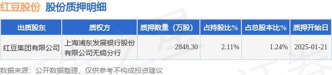 证券之星消息,红豆股份(600400)1月23日公开信息显示,股东红豆集团有限公司向上海浦东发展银行股份有限公司无锡分行合计质押2848.3万股,占总股本1.24%。质押详情见下表: